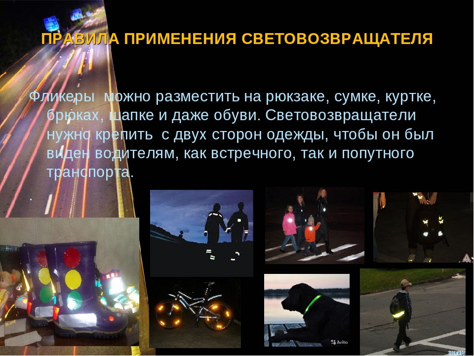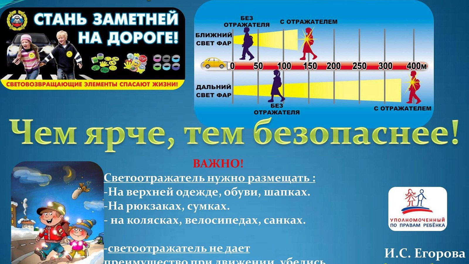 При движении с ближним светом фар водитель автомобиля способен увидеть пешехода на дороге на расстоянии 25- 50 метров. Если пешеход применяет световозвращатель, то это расстояние увеличивается до 150-200 метров. Таким образом, световозвращающие элементы в б,5 раз снижают риск наезда на пешеходов в тёмное время суток.
