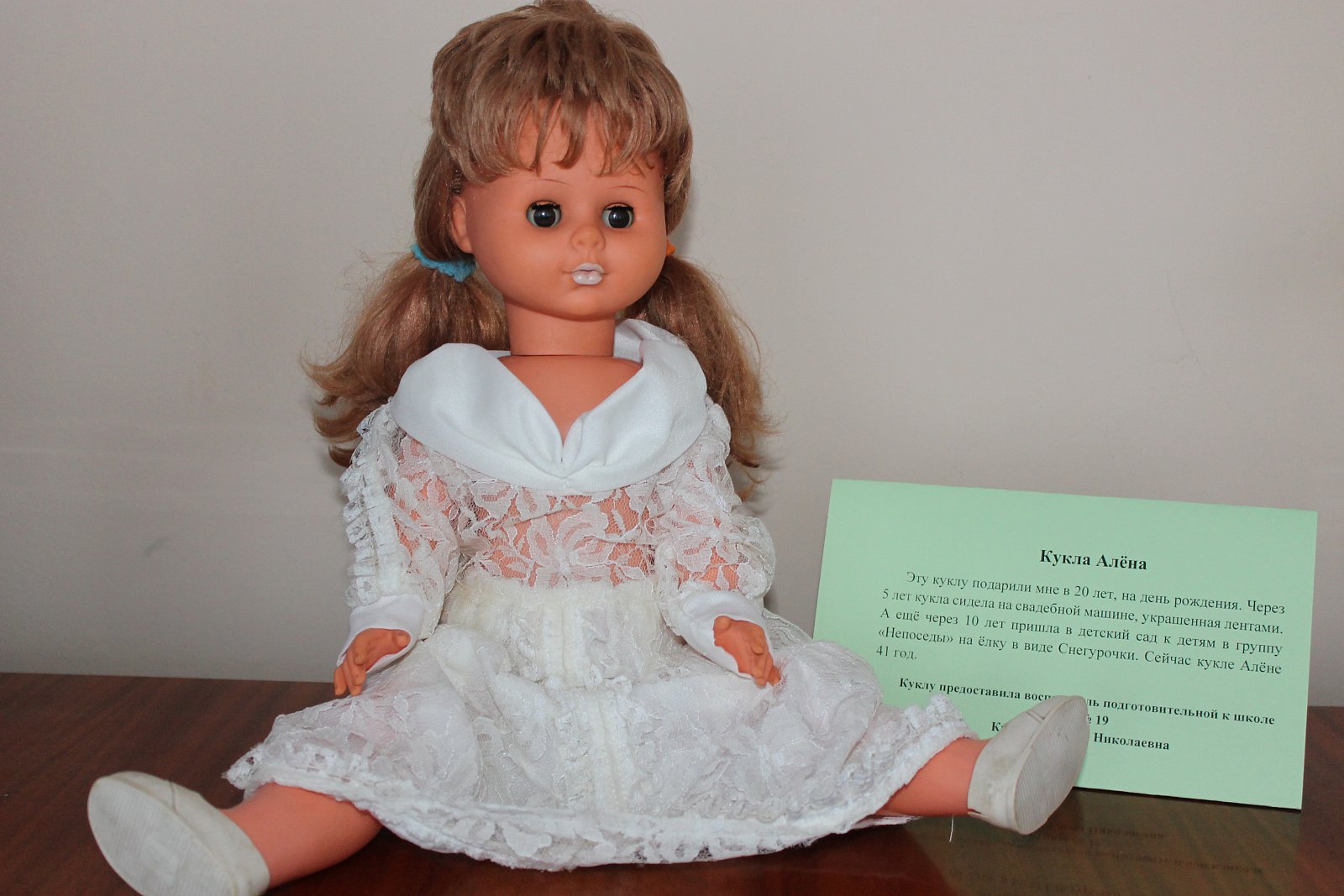 Эта кукла появилась в нашей семье в далёком 1969 году. Она приехала в город Ковров из столицы Узбекской ССР города Ташкент. Её подарила бабушка моего мужа своей дочери (моей свекрови) на её первый день рождения. Это была очень редкая и красивая кукла. Изготовлена она в ГДР. В нашей стране такие появлялись не часто и были мечтой всех девочек. Куклу назвали Алёна. Ей играла моя свекровь, её дети, а теперь и мои дети.