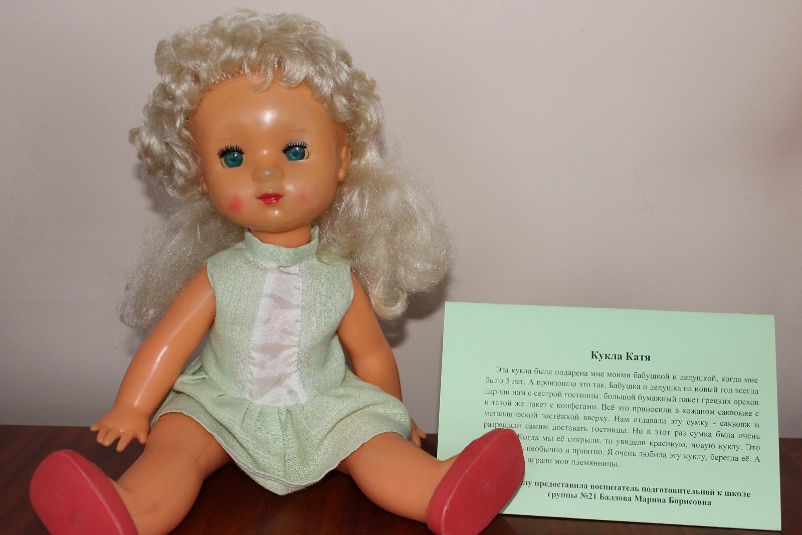 Эта кукла была подарена мне моими бабушкой и дедушкой, когда мне было 5 лет. А произошло это так. Бабушка и дедушка на новый год всегда дарили нам с сестрой гостинцы: большой бумажный пакет грецких орехов и такой же пакет с конфетами. Всё это приносили в кожаном саквояже с металлической застёжкой вверху. Нам отдавали эту сумку - саквояж и разрешали самим доставать гостинцы. Но в этот раз сумка была очень тяжёлая. Когда мы её открыли, то увидели красивую, новую куклу. Это было очень необычно и приятно. Я очень любила эту куклу, берегла её. А потом с ней играли мои племянницы.