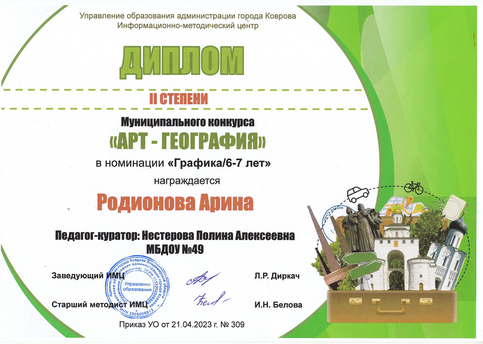 Денисов Глеб получил Диплом I степени в номинации «Графика/6 – 7 лет», а Арина – диплом II степени в той же номинации.