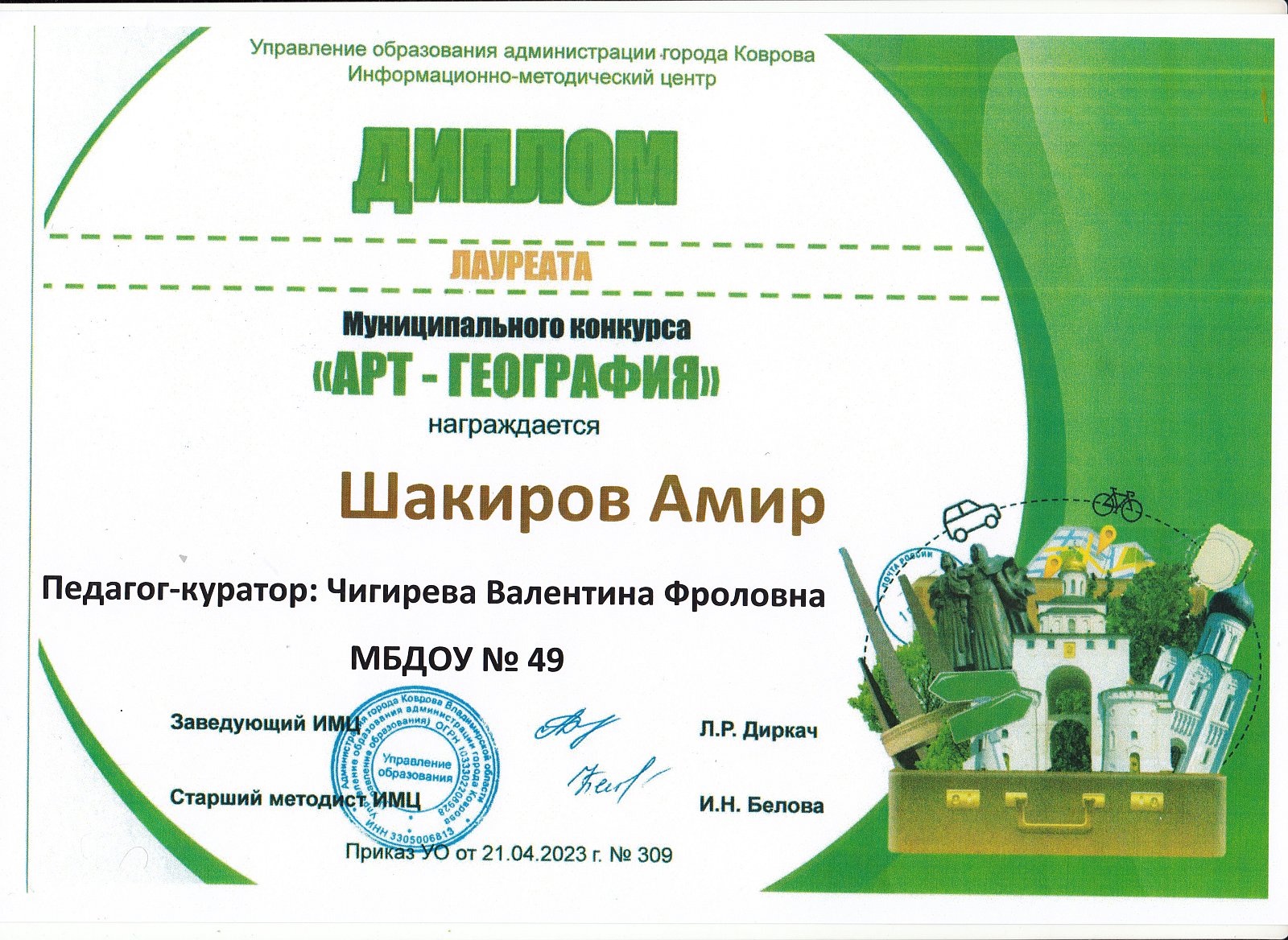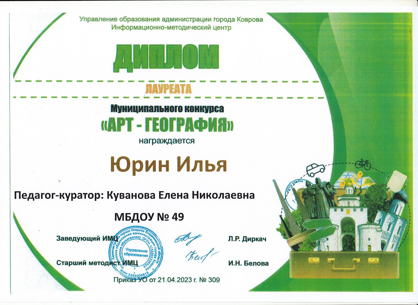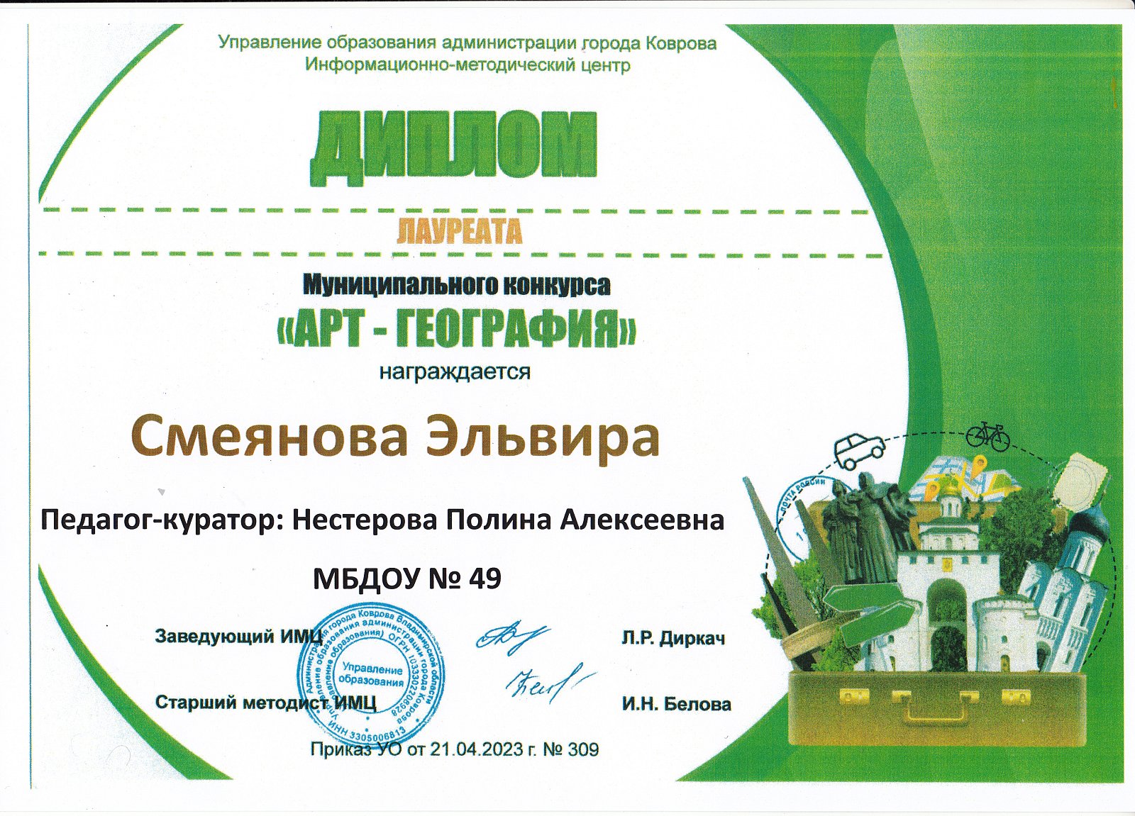Подведены итоги муниципального конкурса «Арт-география», на который свои работы представили 5 наших воспитанников: Денисов Глеб (подготовительная к школе группа № 11, воспитатель Климина Елена Юрьевна), Родионова Арина, Смеянова Эльвира (старшая группа № 17, воспитатель Нестерова Полина Алексеевна), Юрин Илья (подготовительная к школе группа № 19, воспитатель Куванова Елена Николаевна), Шакиров Амир (подготовительная к школе группа № 21, воспитатель Чигирева Валентина Фроловна).
