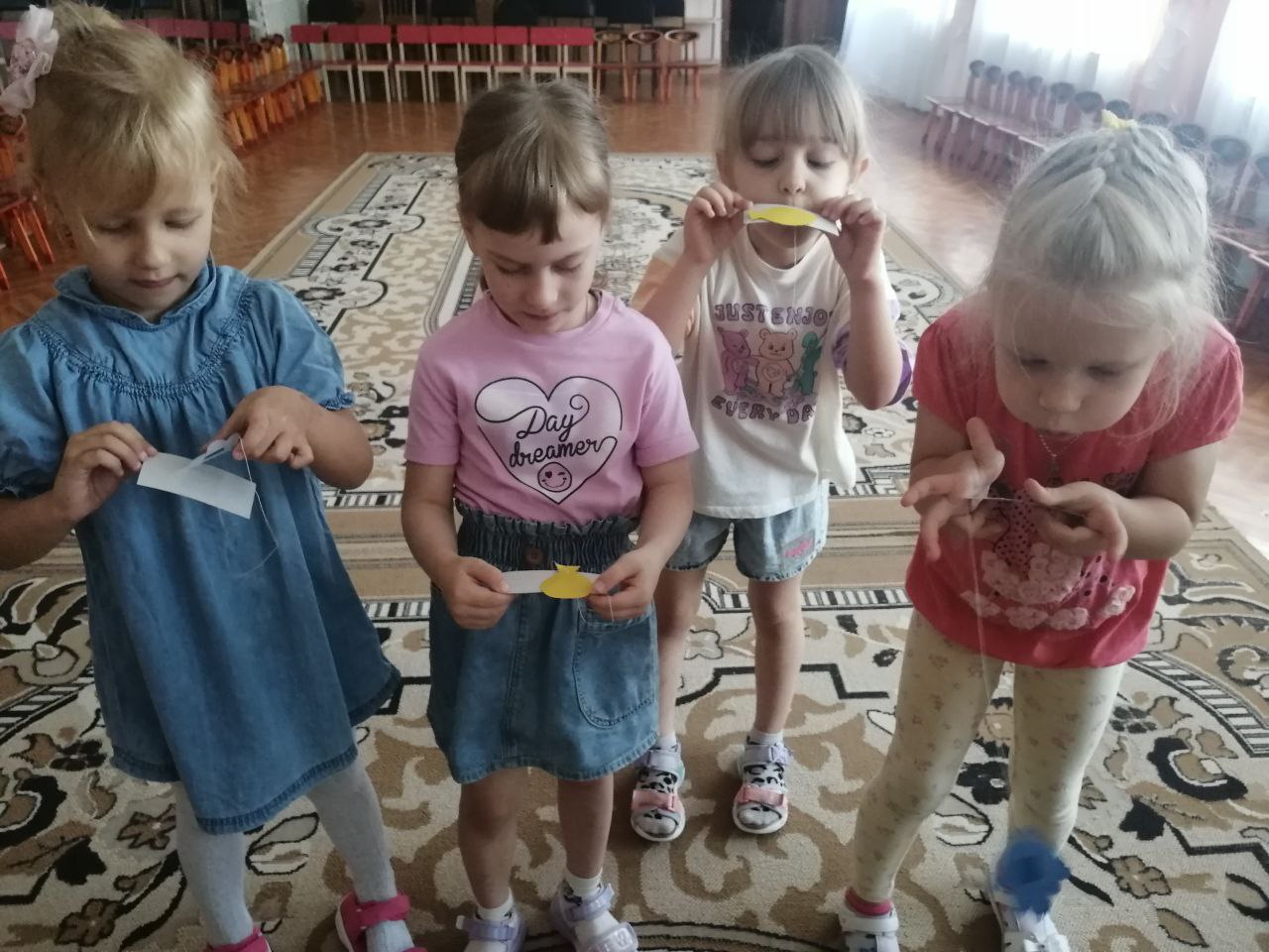 Вторник «Познаём, исследуем, развиваемся» был посвящён наблюдениям и экспериментам. Дети наблюдали за движением воздуха (облака, ветви деревьев), отслеживали направление и силу ветра по деревьям ленточкам, флажкам. А также провели эксперименты: