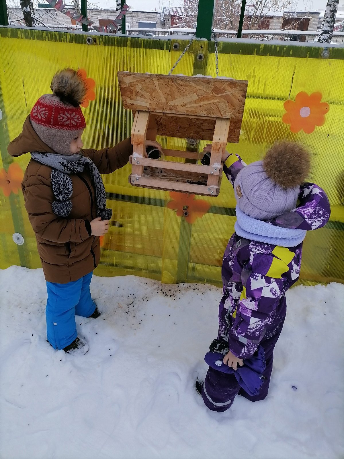 Наши воспитанники помогают птицам. Они изготовили и развесили на своих участках кормушки для птиц и каждый день подкармливают их.