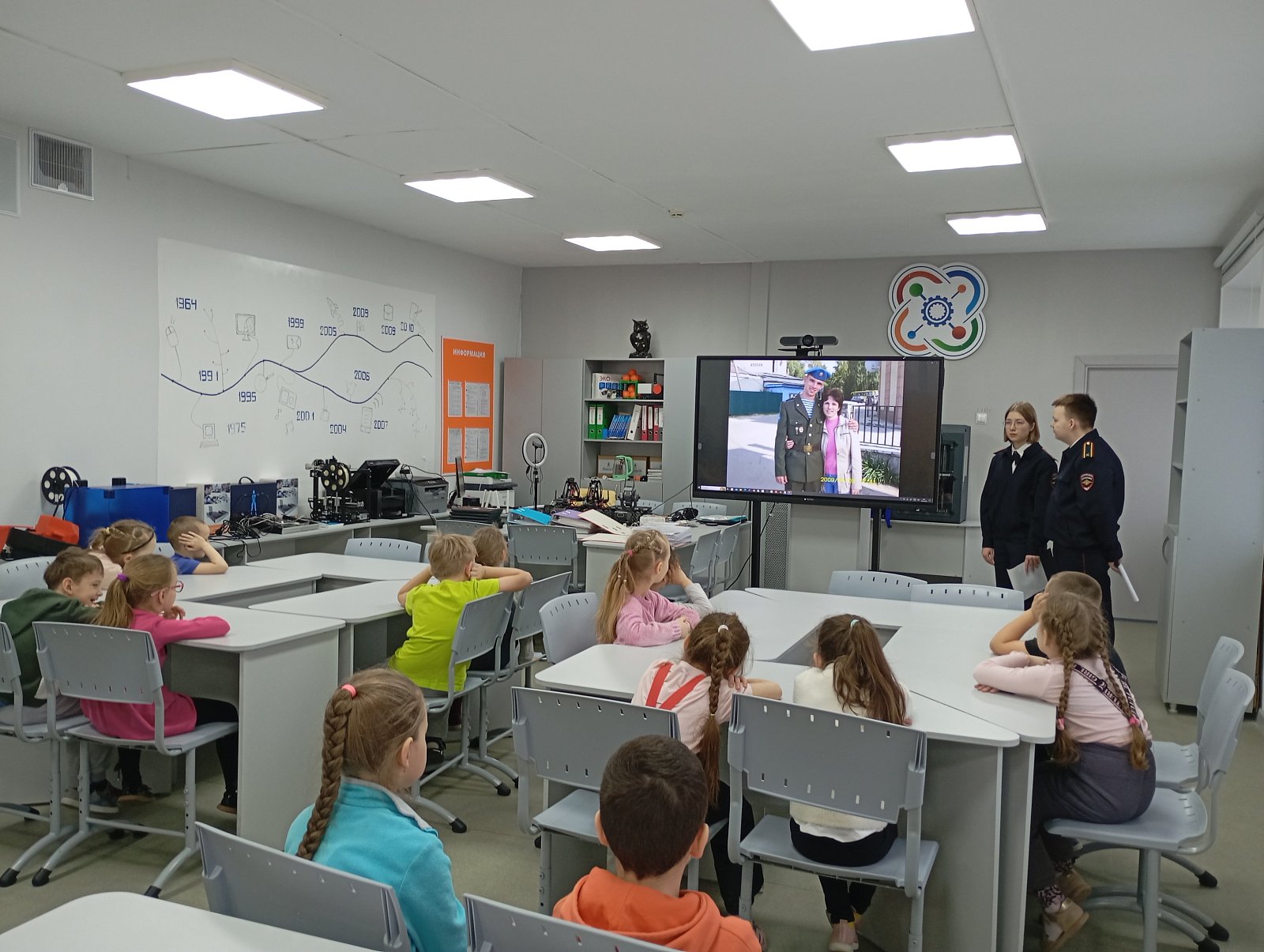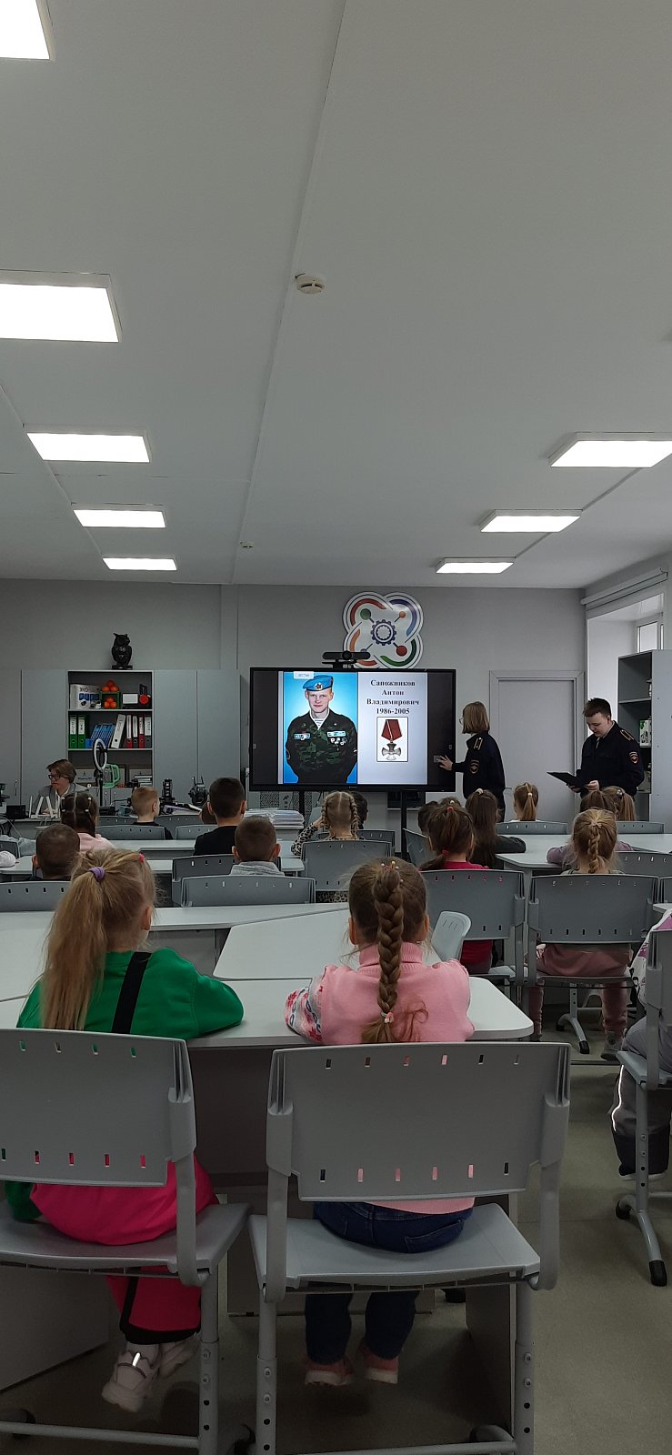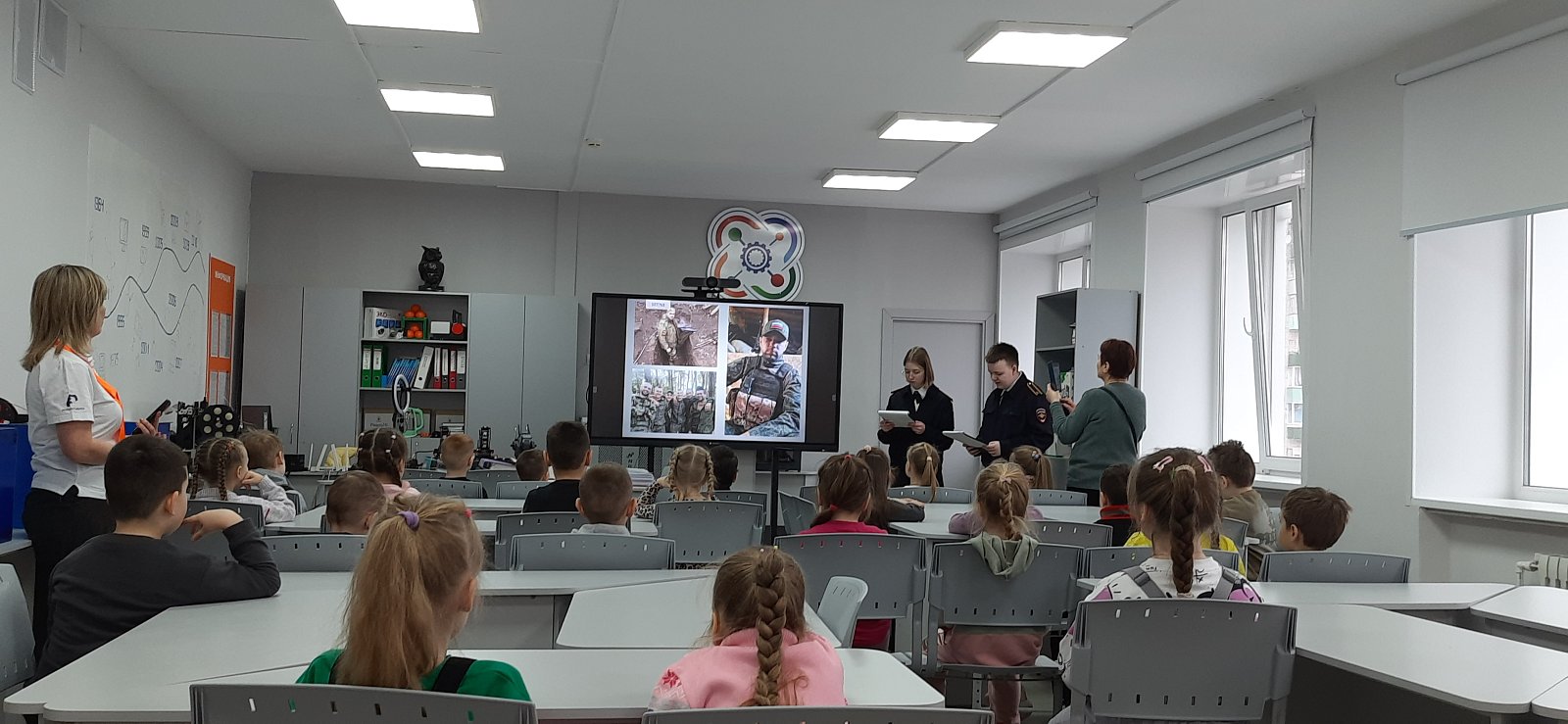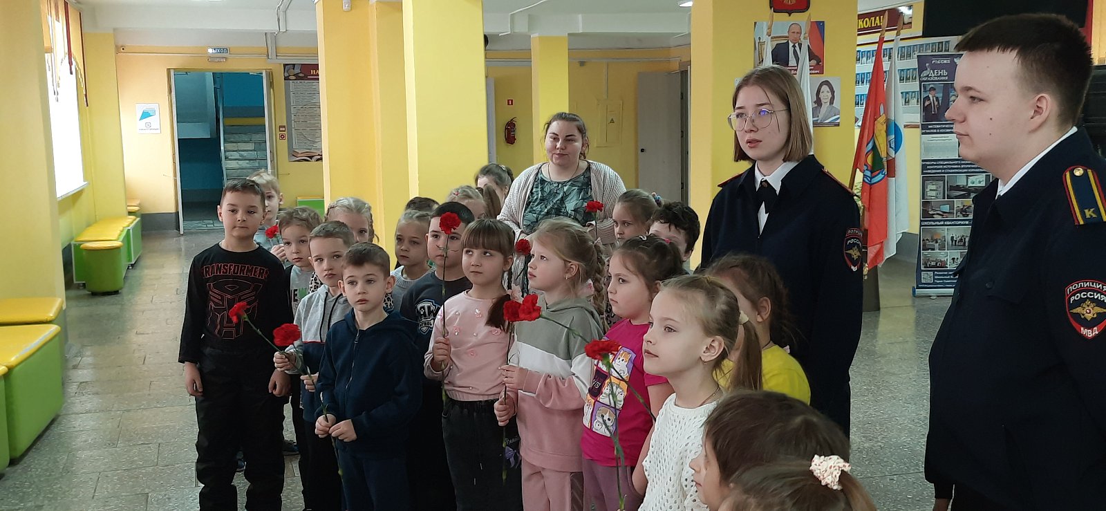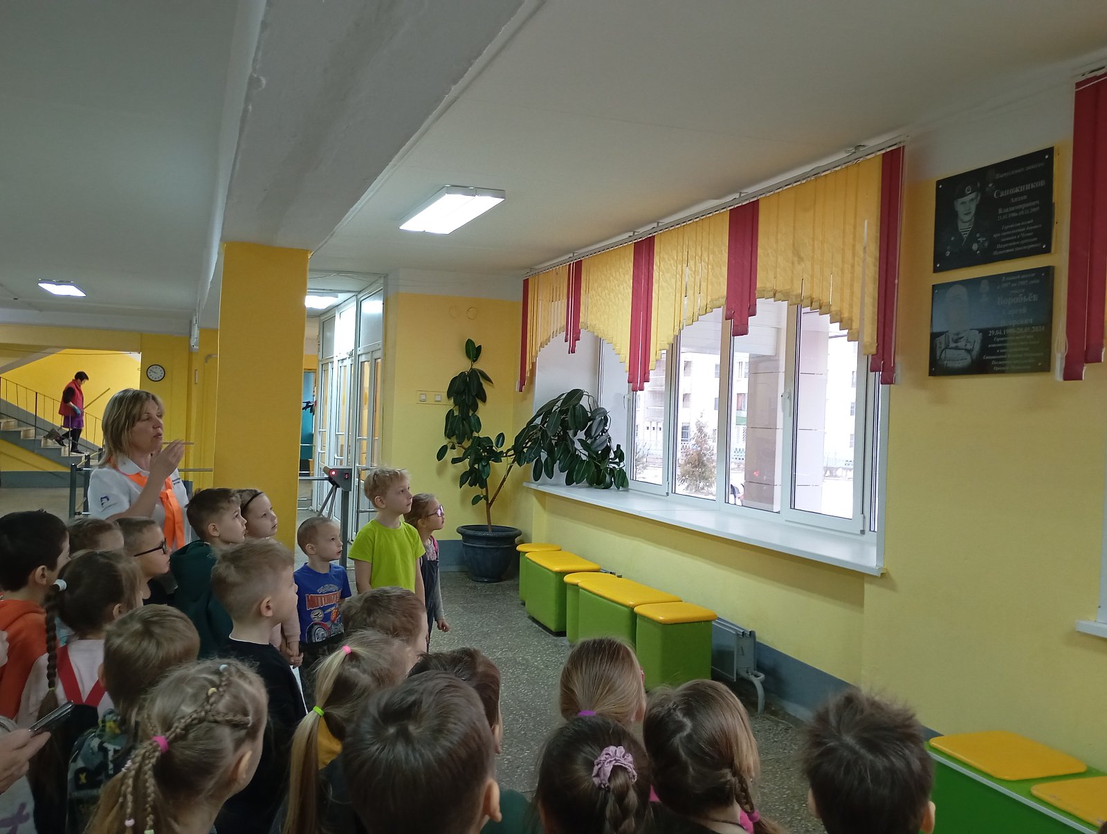 Иванова Софья и Ковалёв Михаил, ученики 8 класса, рассказали детям о героях, которые учились в школе № 23 и погибли, защищая Родину.