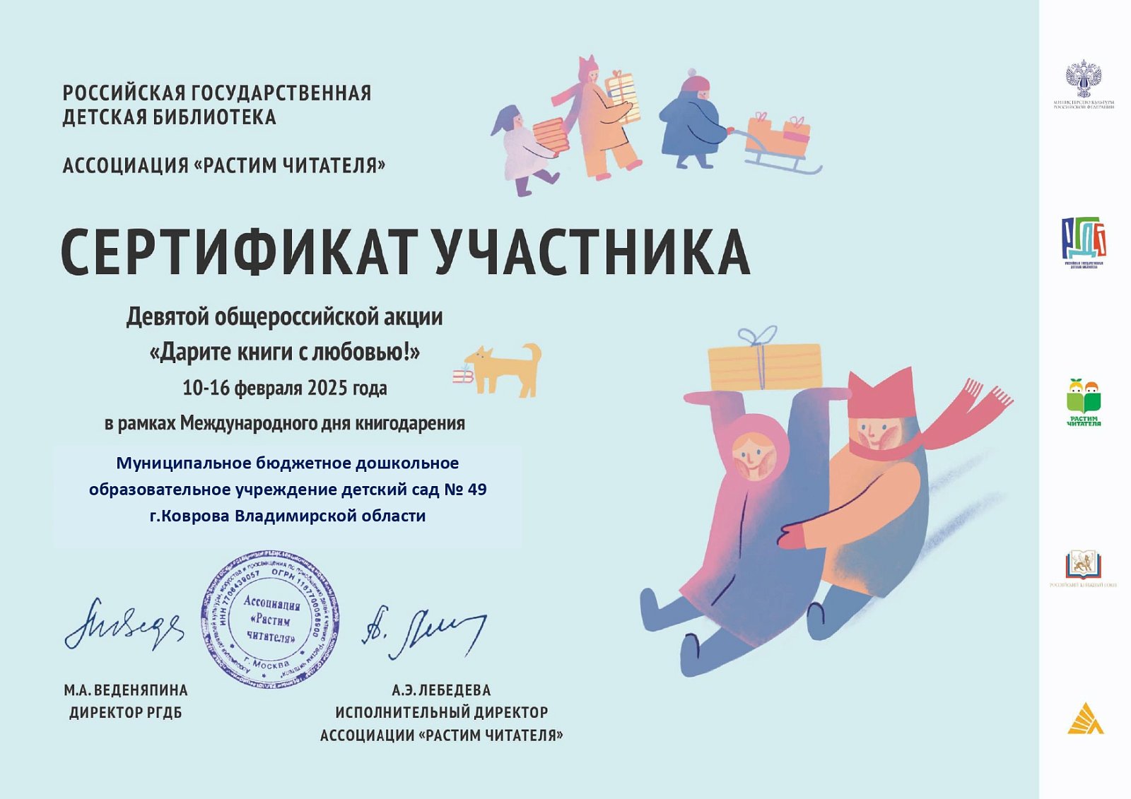 Более 50 семей воспитанников нашего детского сада приняли участие в девятой общероссийской акции «Дарите книги с любовью», которая прошла с 10 по 16 февраля 2025 года. Российская государственная детская библиотека и Ассоциация «Растим читателя» провели акцию при поддержке Минкультуры России, Российского книжного союза и Ассоциации книгораспространителей.