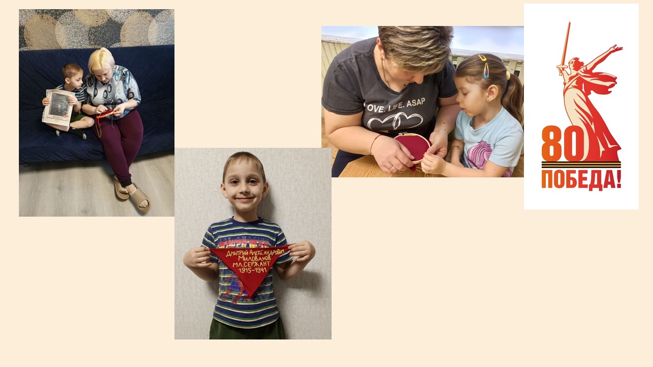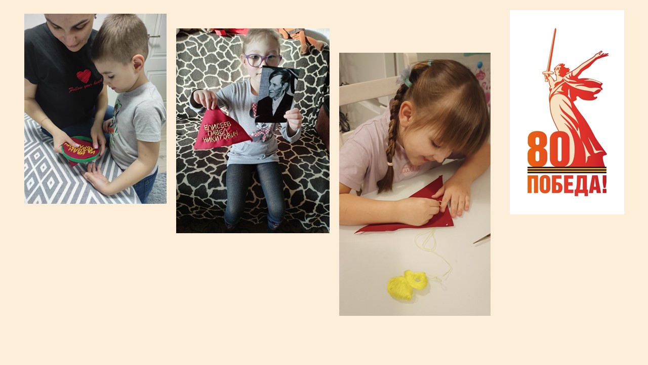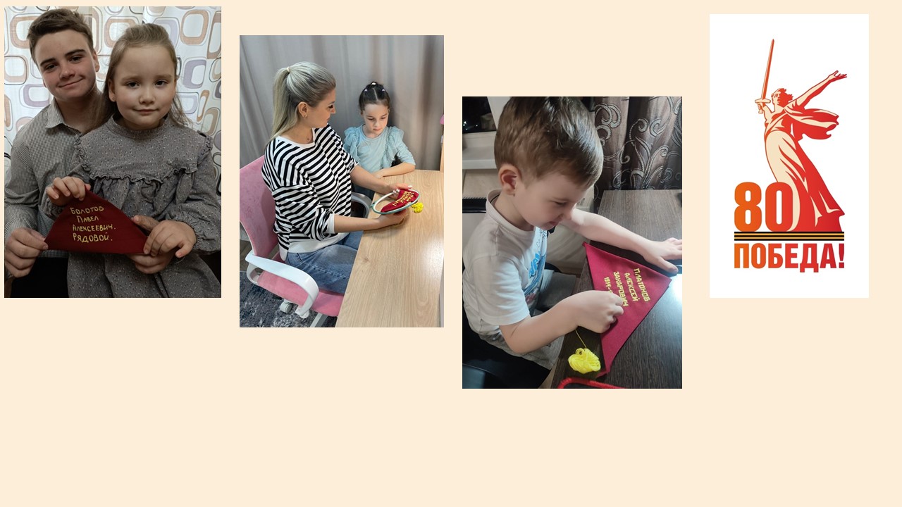 Ценно то, что дети принимали непосредственное участие в изготовлении треугольников. Они вышивали имена и фамилии своих родственников, отстоявших мир.