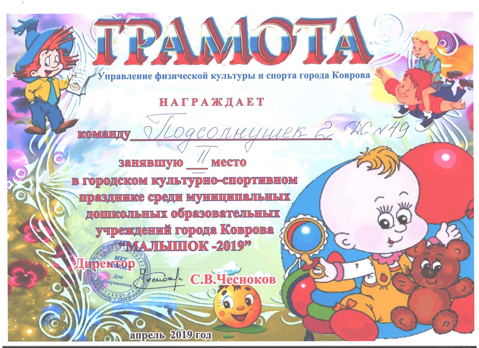 19 апреля 2019 года дети МБДОУ № 49 достойно выступили на первом этапе городских спортивных соревнований "Малышок". Они заняли 1 и 2 место среди команд МБДОУ №№ 23 и 59. Юные спортсмены продемонстрировали быстроту, ловкость, стремление к победе, взаимопомощь.